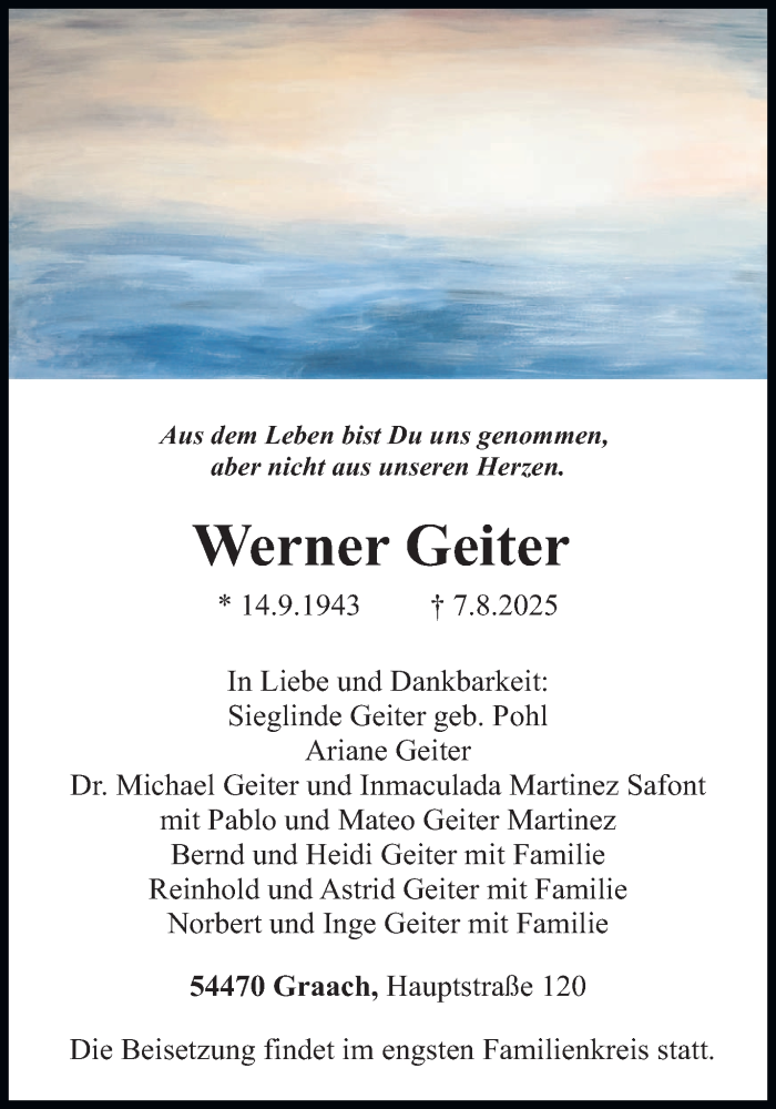 Hier finden Sie alle Traueranzeigen aus der Zeitung, die bisher für Werner Geiter erschienen sind. Weitere Traueranzeigen, die in der Zeitung erscheinen, werden hier ebenfalls aufgelistet