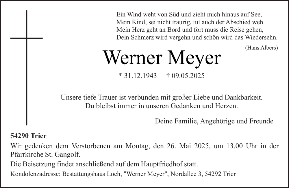 Hier finden Sie alle Traueranzeigen aus der Zeitung, die bisher für Werner Meyer erschienen sind. Weitere Traueranzeigen, die in der Zeitung erscheinen, werden hier ebenfalls aufgelistet