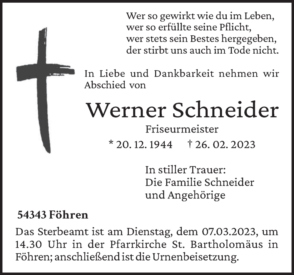 Hier finden Sie alle Traueranzeigen aus der Zeitung, die bisher für Werner Schneider erschienen sind. Weitere Traueranzeigen, die in der Zeitung erscheinen, werden hier ebenfalls aufgelistet