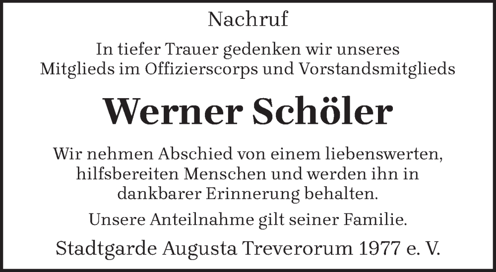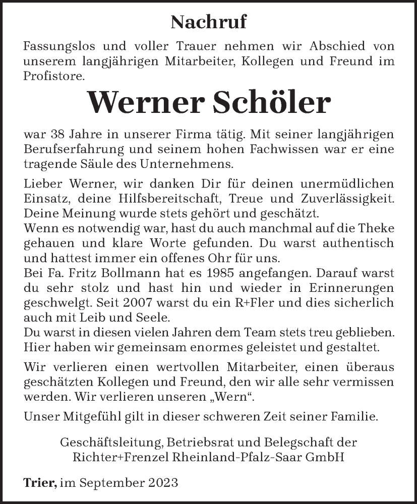 Hier finden Sie alle Traueranzeigen aus der Zeitung, die bisher für Werner Schöler erschienen sind. Weitere Traueranzeigen, die in der Zeitung erscheinen, werden hier ebenfalls aufgelistet