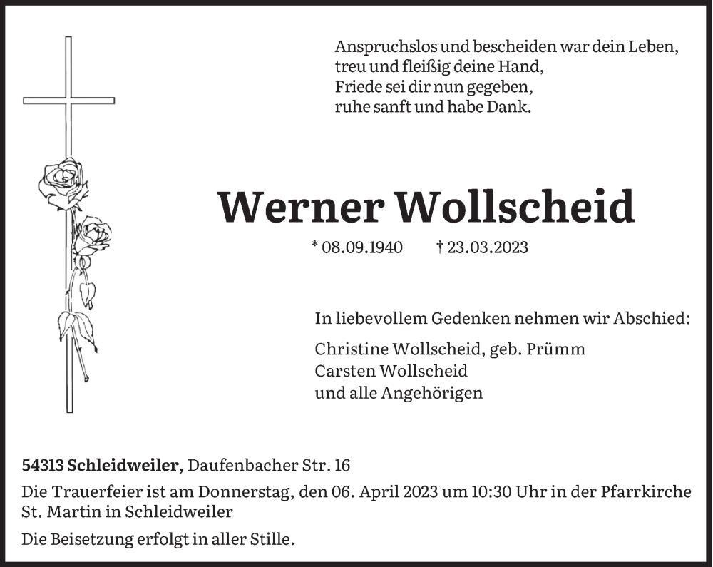 Hier finden Sie alle Traueranzeigen aus der Zeitung, die bisher für Werner Wollscheid erschienen sind. Weitere Traueranzeigen, die in der Zeitung erscheinen, werden hier ebenfalls aufgelistet