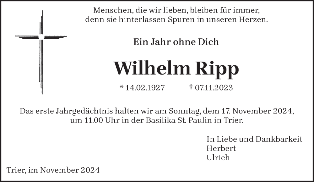 Hier finden Sie alle Traueranzeigen aus der Zeitung, die bisher für Wilhelm Ripp erschienen sind. Weitere Traueranzeigen, die in der Zeitung erscheinen, werden hier ebenfalls aufgelistet