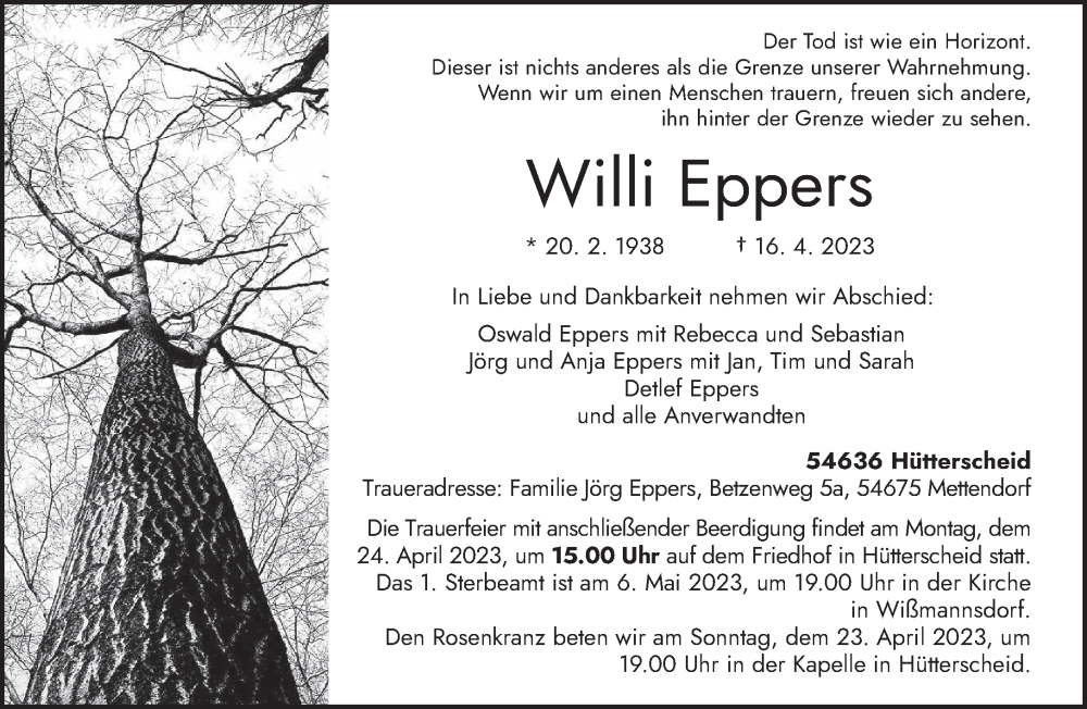 Hier finden Sie alle Traueranzeigen aus der Zeitung, die bisher für Willi Eppers erschienen sind. Weitere Traueranzeigen, die in der Zeitung erscheinen, werden hier ebenfalls aufgelistet