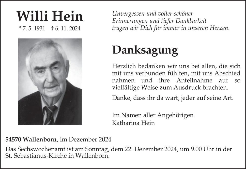 Hier finden Sie alle Traueranzeigen aus der Zeitung, die bisher für Willi Hein erschienen sind. Weitere Traueranzeigen, die in der Zeitung erscheinen, werden hier ebenfalls aufgelistet