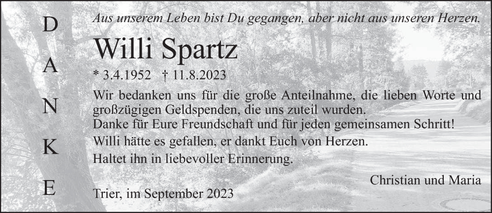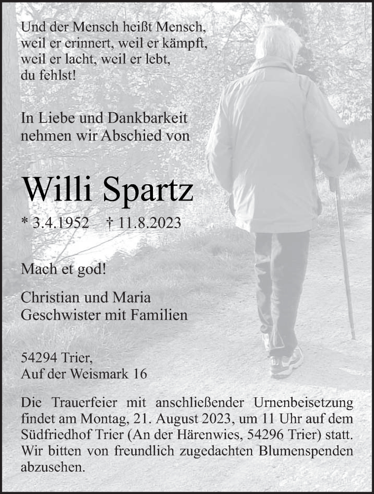 Hier finden Sie alle Traueranzeigen aus der Zeitung, die bisher für Willi Spartz erschienen sind. Weitere Traueranzeigen, die in der Zeitung erscheinen, werden hier ebenfalls aufgelistet