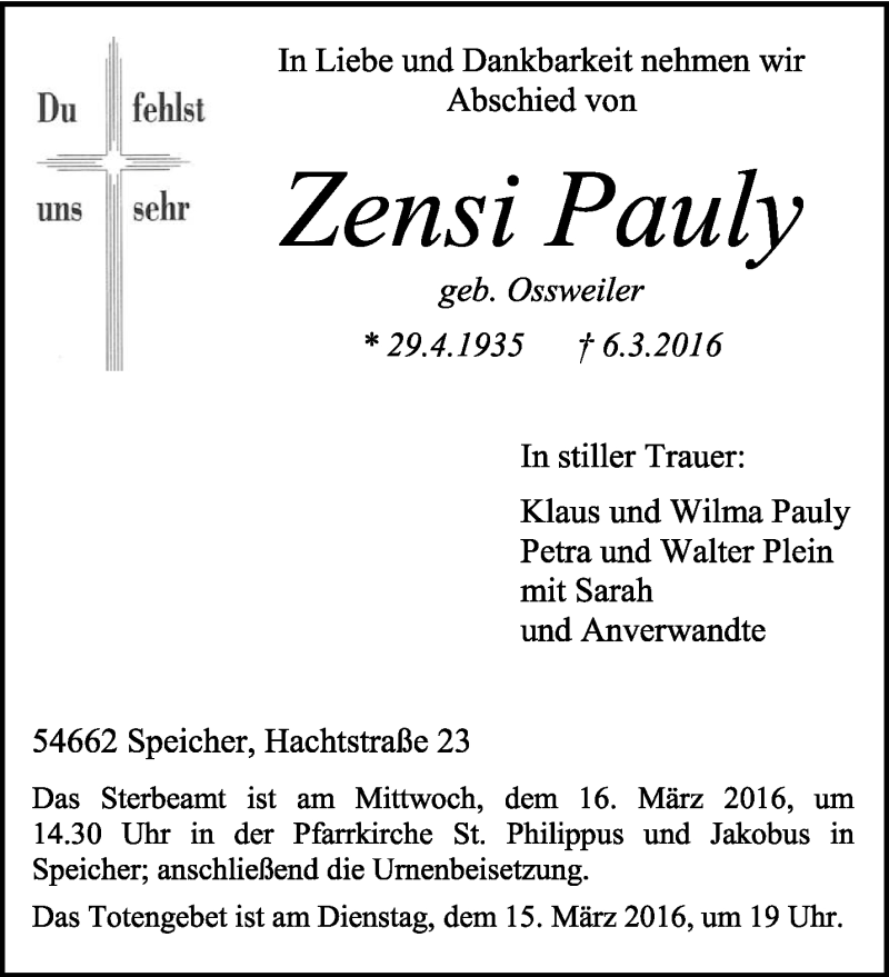 Hier finden Sie alle Traueranzeigen aus der Zeitung, die bisher für Zensi Pauly erschienen sind. Weitere Traueranzeigen, die in der Zeitung erscheinen, werden hier ebenfalls aufgelistet